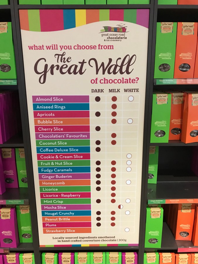 Sanna had this chocolate that she loved at work and found out that it is in Torquay at the beginning of the GOR. So essentially we raced back to other side of the GOR to the Great Ocean Road Chocolaterie & Ice Creamery before it closed to stock up on some good chocolate and get a coffee for the road.